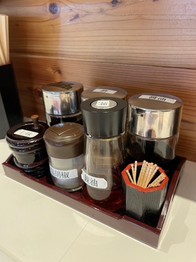 餃子のタレ以外にも、お酢や胡椒、ラー油といった調味料が置いてあります。