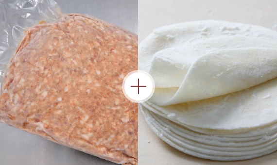 餃子皮と味付き肉をご納品。キャベツはお客様側で加工していただき、味付き肉とミックス。餡を仕入れるよりも、コストを抑えられます。