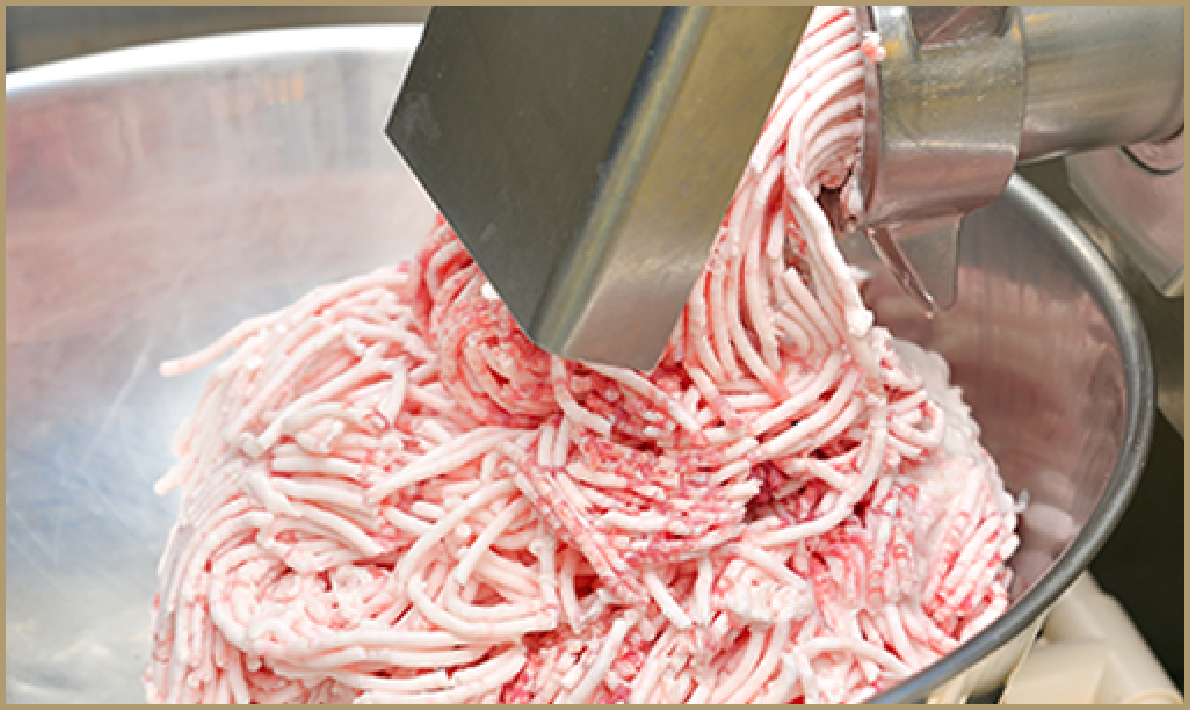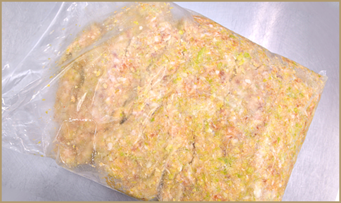 自作で餡をつくる場合、低温で40分練り続けなければならないので、多大な労力がかかります。伸和食品では、味付け済の調合肉をご提供しておりますので、そのまま脱水キャベツを合わせるだけで、誰でも簡単に餡を作ることができます。